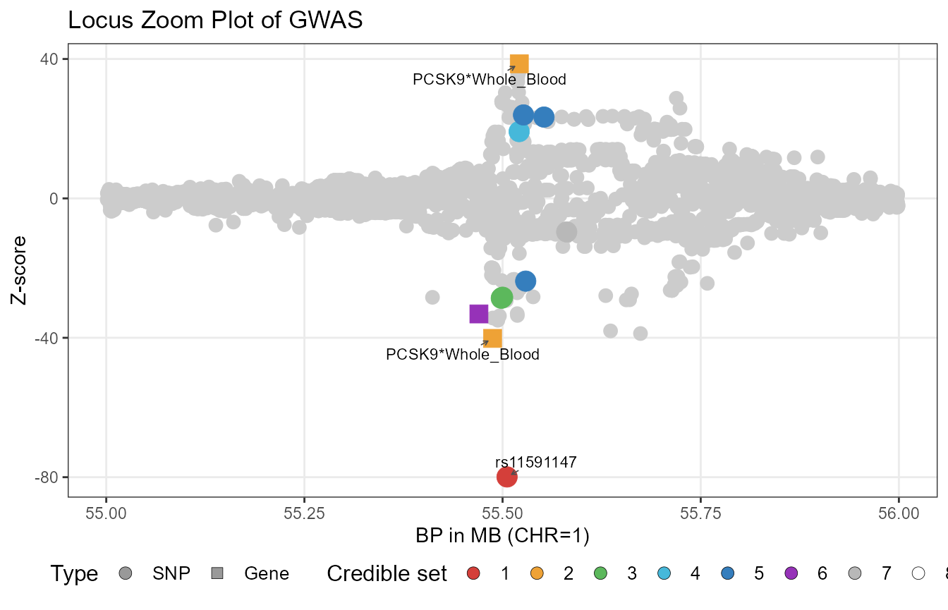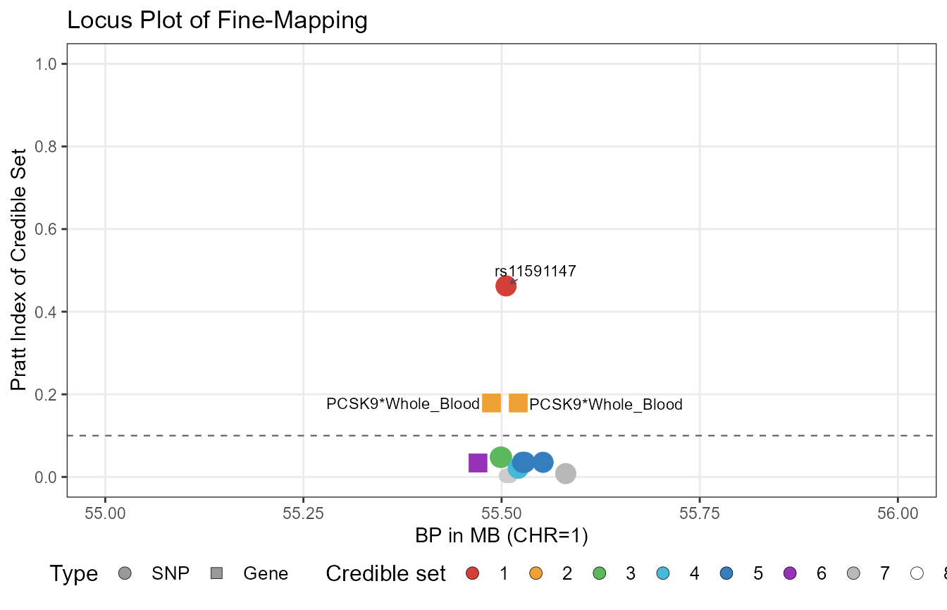 #> 20 SNP -3.0409528 0.24198672 0.0006846112From the results, we can see that TGVIS first identified a missense variant in PCSK9, rs11591147, with a Pratt index of 0.462. This SNP is the PCSK9 variant initially reported by NEJM. TGVIS also identified the PCSK9-Whole_Blood gene-tissue pair, which has two causal eQTLs with a Pratt index of 0.179. TGVIS additionally identified multiple credible sets with Pratt indices not exceeding 0.05. However, PCSK9 is one of the most significant loci for LDL-C, so even though the Pratt index is low, this is only relative to this locus. Cross-loci comparison using Pratt indices is not valid.
